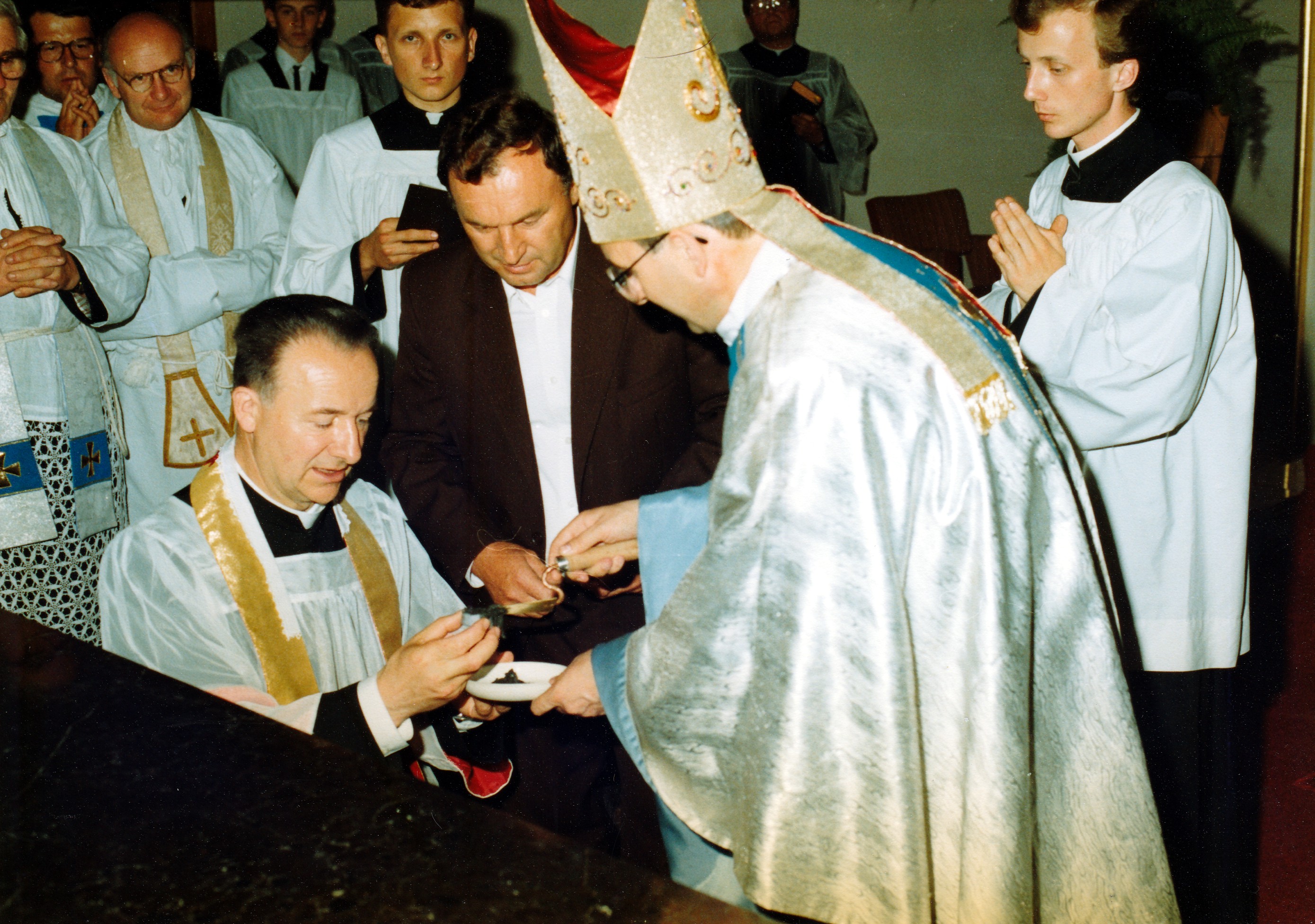 16 lipca 1991 r. - uroczysta konsekracja nowego kościoła parafialnego w Dobrej przez ks. bp. Józefa Życińskiego i nadanie wezwania Matki Bożej Szkaplerznej. Na fotografii wmurowanie relikwii bł. Karoliny Kózki. Żródło: Archiwum Parafii Dobra.