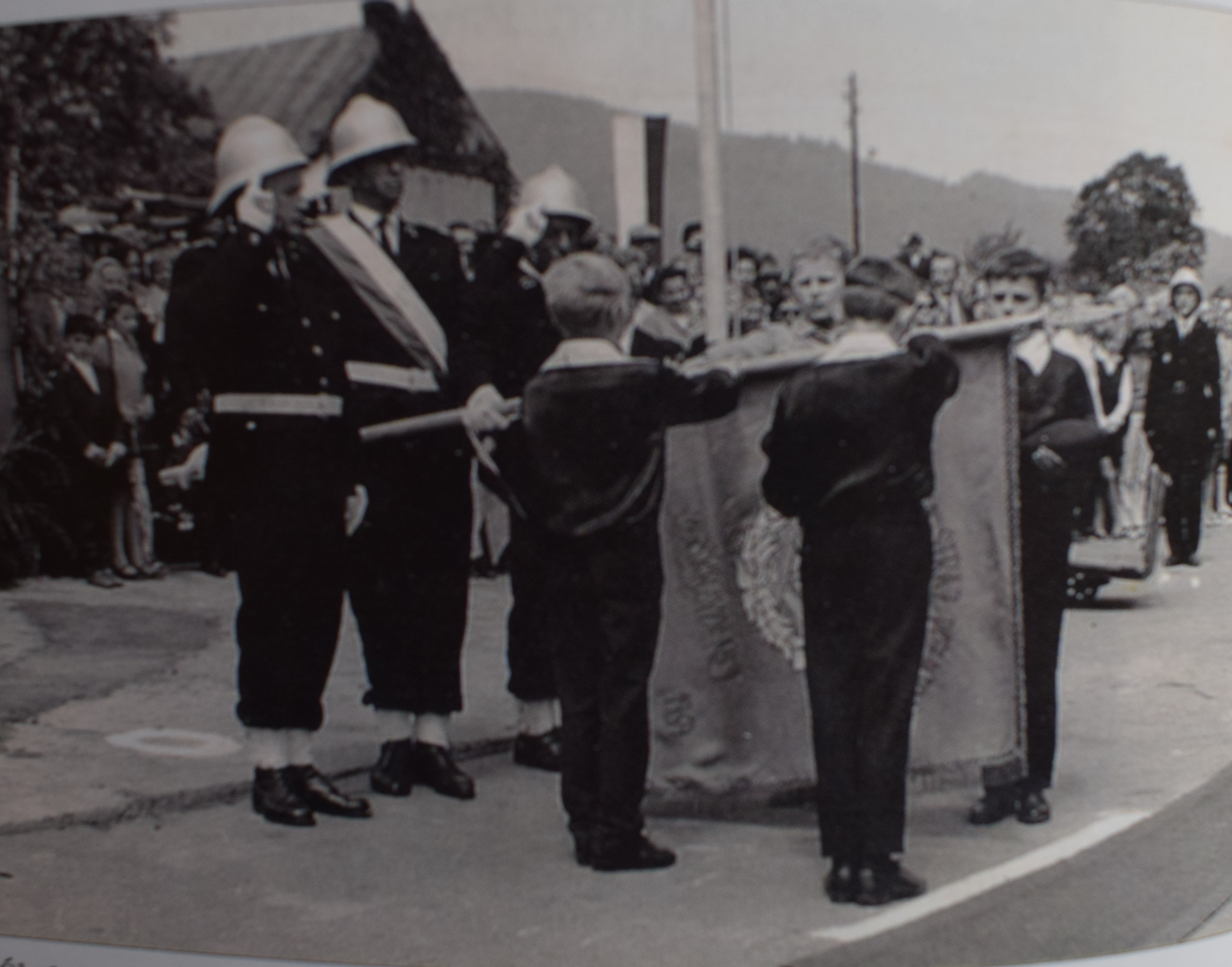 Uroczystość poświęcenia sztandaru OSP Skrzydlna w 1970 r. Na fotografii ślubowanie na sztandar Młodzieżowej Drużyny Pożarniczej. Źródło: Źródło: Strażacy Ziemi Limanowskiej, red. S. Bukowiec, Bochnia 2010, s. 40.