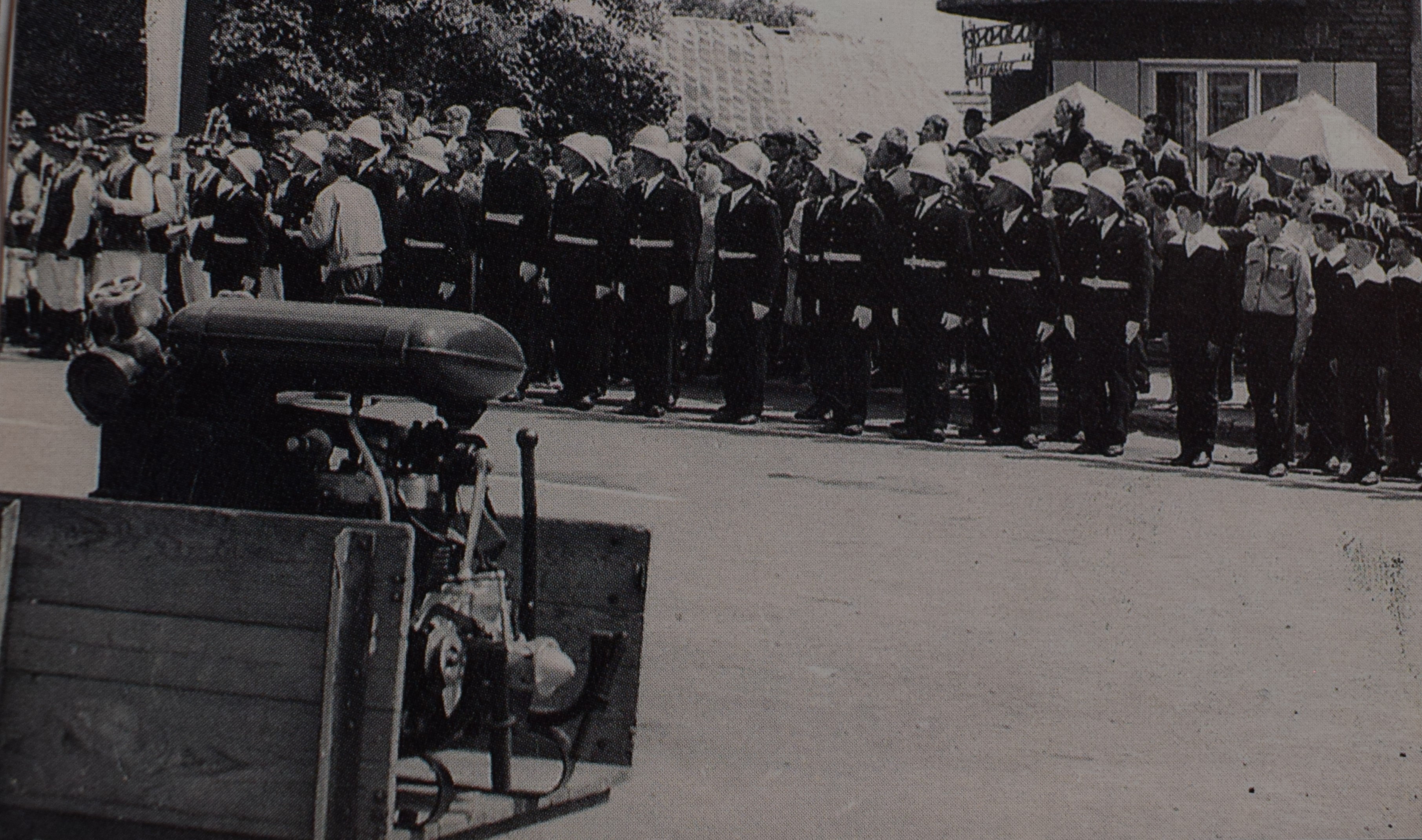 Motopompa przyznana strażakom ze Skrzydlnej w 1970 r. Na zdjęciu uroczystość przekazania. Źródło: Strażacy Ziemi Limanowskiej, red. S. Bukowiec, Bochnia 2010, s. 40.