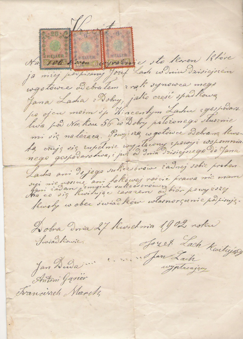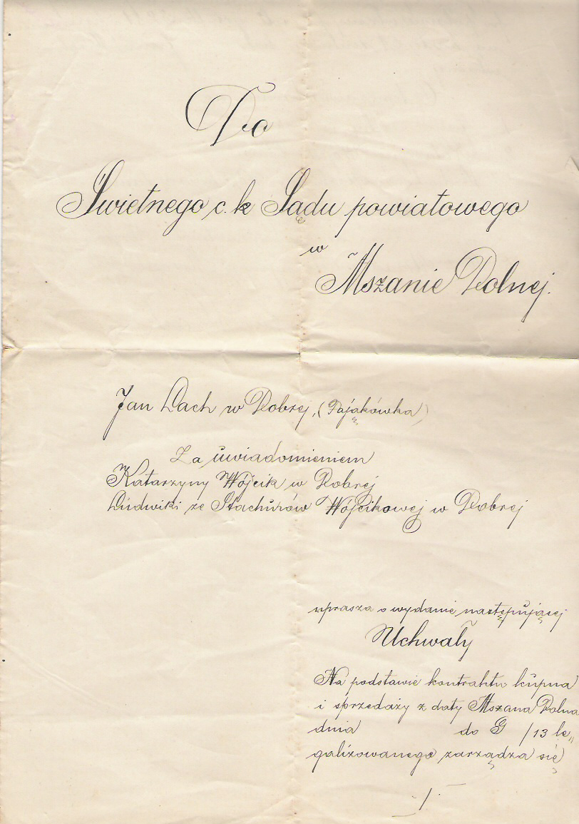 Pismo wójta gminy Dobra, Jana Lacha /notabene mojego pradziadka/ do Sądu w Mszanie Dolnej. Strona 1