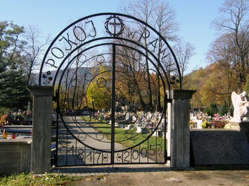 Brama na cmentarz parafialny w Dobrej, wykonana w 2005 r. Data na lewym skrzydle wskazuje na pierwszy pochówek po przeniesieniu cmentarza poza mur kościelny. Fot. S. Rząsa [www.beskidy.gminadobra.pl].