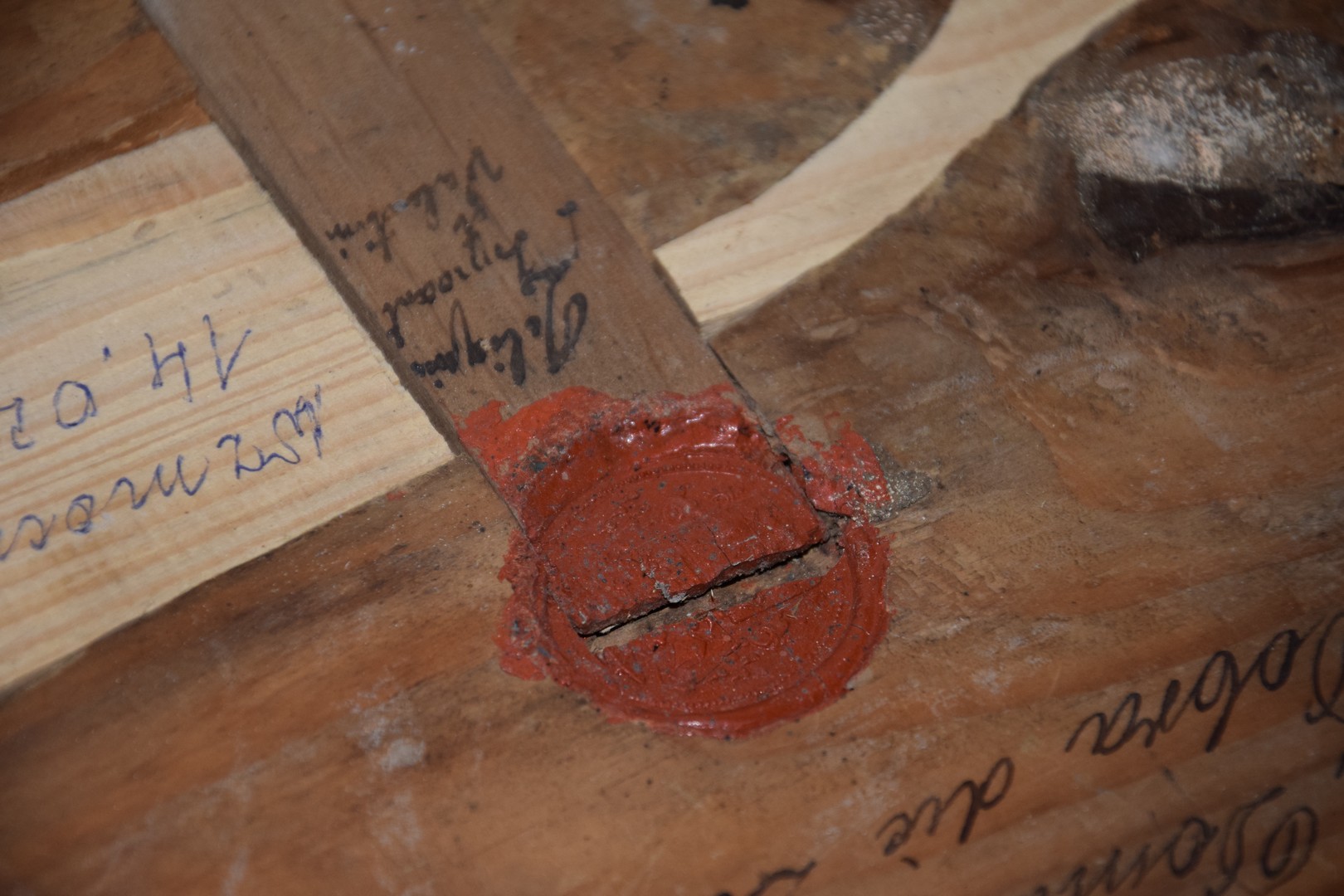 Pieczęć lakowa na portatylu, a pod nią napis: "Reliquis S. Innocenti et Valentini". Fot. A. Cieślik