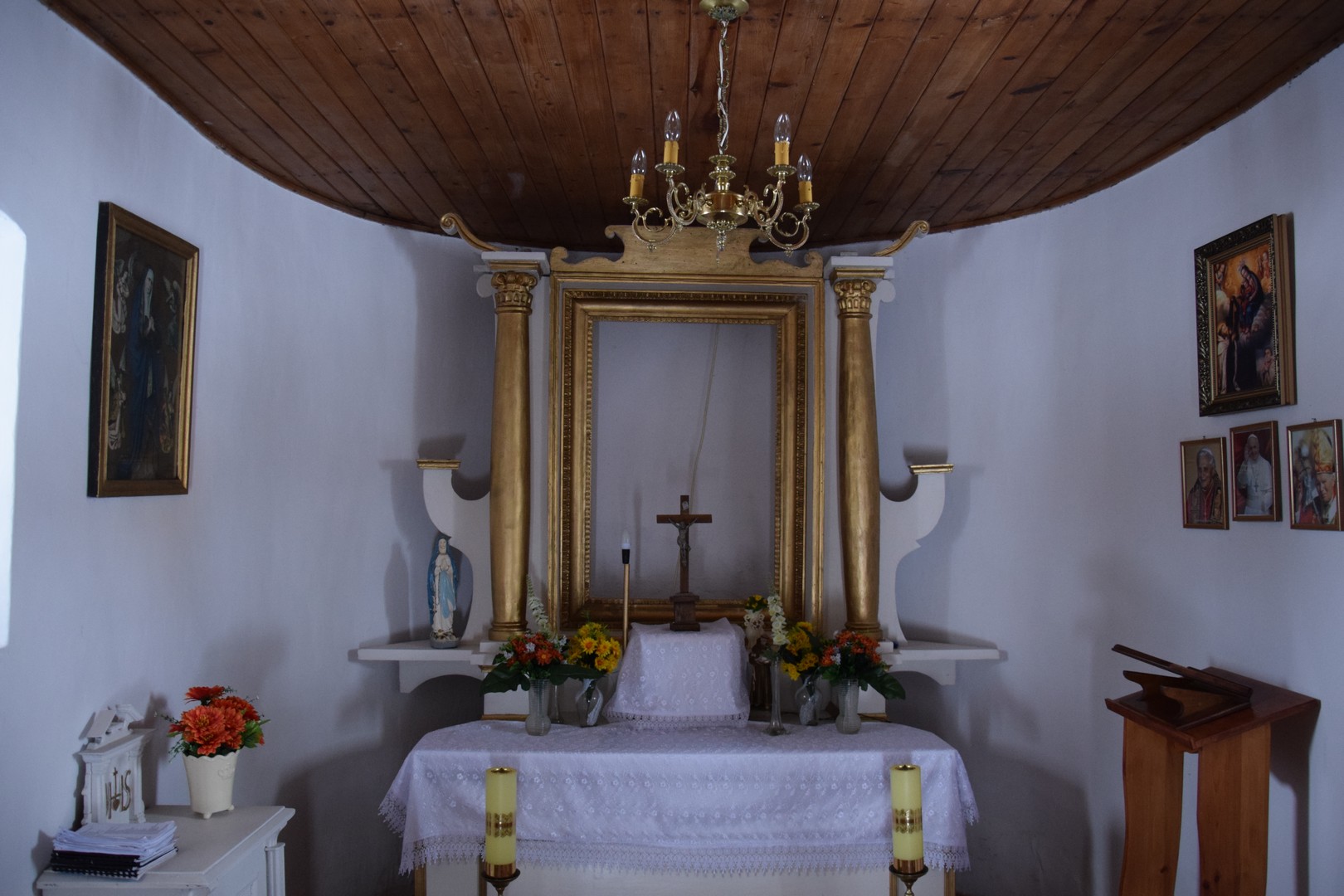 Wnętrze kaplicy w Jurkowie Dolnym. Zdjęcie wykonane w 2018 r., kiedy obraz główny był w konserwacji. Fot. A. Cieślik