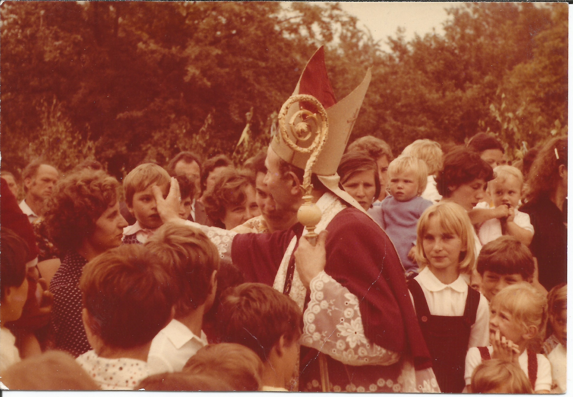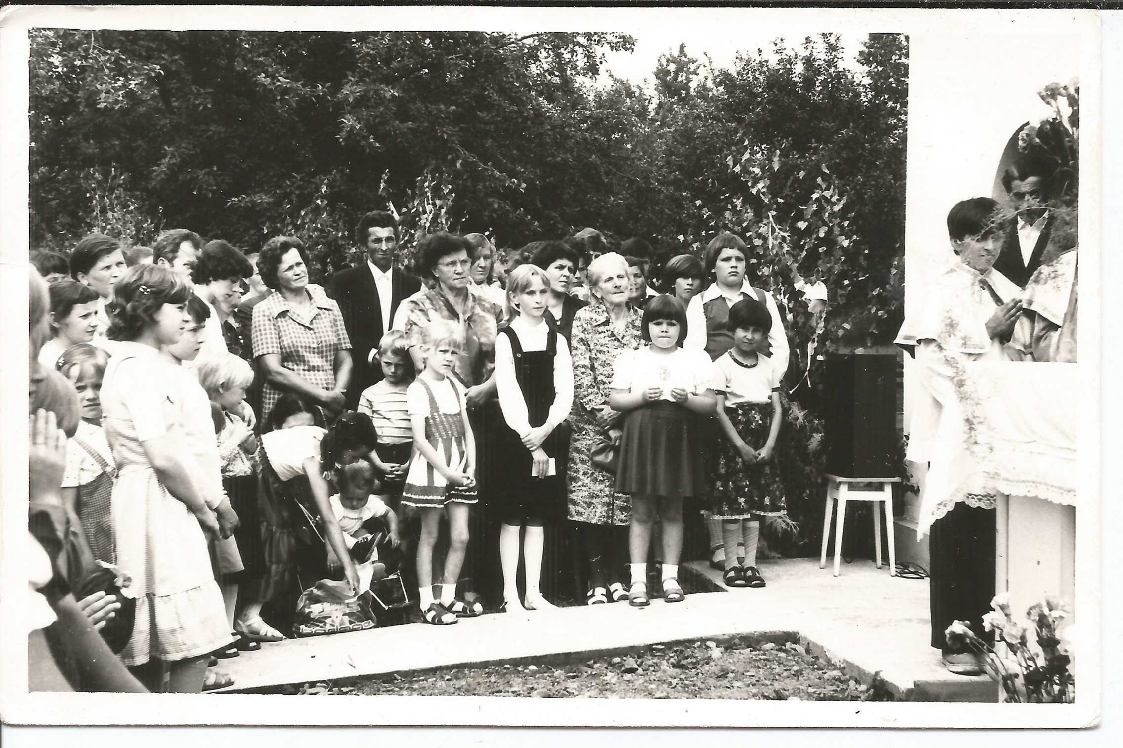 Uroczysta Msza Święta w kaplicy w Jurkowie Dolnym, w drugi dzień Zielonych Świątek, z udziałem biskupa Władysława Bobowskiego,1985 r. Fot. Archiwum prywatne p. Bronisławy Palka.